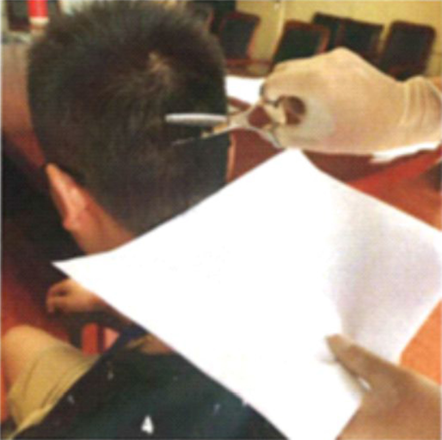 第一步采樣:使用多齒剪從被測者頭頂枕部采集適量近發(fā)根頭發(fā)(若頭發(fā)采集困難可用汗毛、腋毛替代)