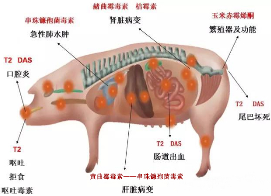 今年自入秋以來,尤其華北地區(qū),接連不斷的降雨,將嚴(yán)重影響今年的秋收和秋種,玉米作為主產(chǎn)區(qū)之一,對(duì)于其收獲和晾曬收藏嚴(yán)重受到影響,玉米質(zhì)量也隨之下降,嚴(yán)重營養(yǎng)著養(yǎng)殖企業(yè)的飼料安全情況。其次長期的潮濕會(huì)對(duì)養(yǎng)殖行業(yè)的環(huán)境、飼料帶來受潮、發(fā)霉的危害。說起霉菌毒素首先想到玉米,其次還有豆粕、麩皮、小麥、魚粉等原料在一定條件下均可產(chǎn)生霉菌毒素。霉菌毒素對(duì)養(yǎng)豬行業(yè)造成的危害是十分巨大的,一旦豬群收到了霉菌毒素的污染,那么各種疾病的發(fā)病率就會(huì)節(jié)節(jié)攀升,像我們已知的藍(lán)耳病、 圓環(huán)病毒、偽狂犬病、豬瘟、衣原體病、弓紅蟲病等經(jīng)常困擾。同時(shí)還會(huì)破壞豬的機(jī)體器官,造成腸道受損,肝臟損壞等疾病, 而且同時(shí)母豬的生產(chǎn)能力也會(huì)下降、幼崽發(fā)病率提高,采食量下降或者拒食,導(dǎo)致豬群生長緩慢,飼料報(bào)酬降低,瘦肉率也大大降低。 豬群免疫力直線下降:疫苗的保護(hù)力大大降低,豬群交叉感染及其嚴(yán)重,藥物治療效果差,豬群的死亡率大大增加。