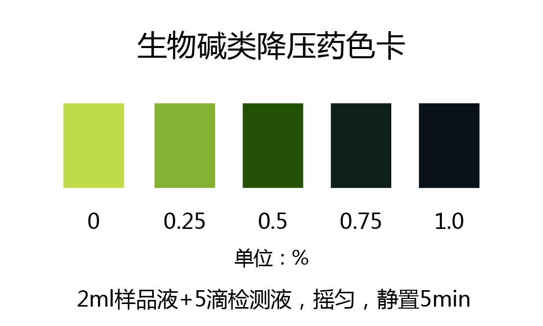 取上述濾液2ml于玻璃比色皿或試管中,加入5滴檢測(cè)液,振蕩混勻,靜置5min,對(duì)照色卡比色,生物堿類降壓藥含量越高,顏色越深;