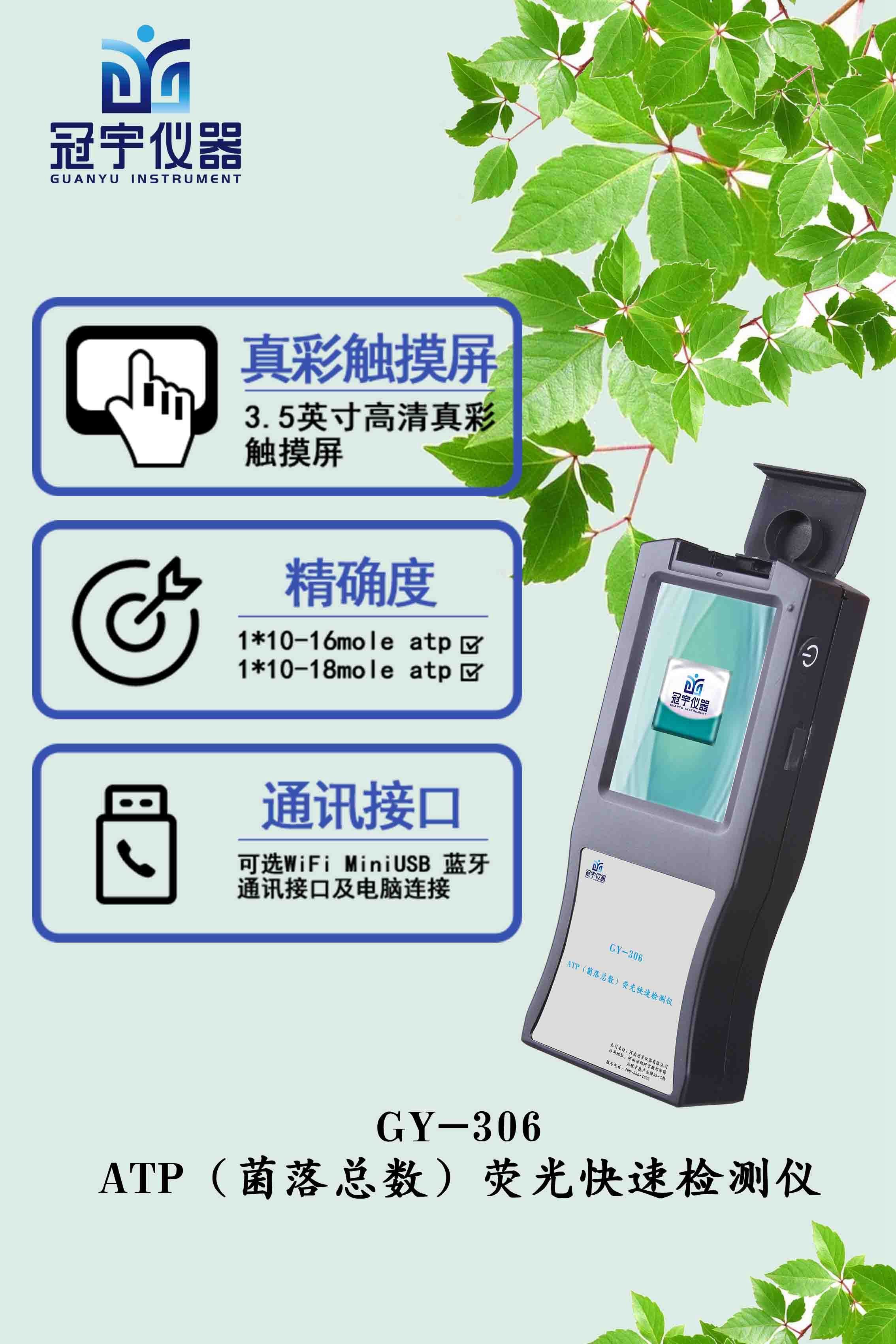 ATP熒光檢測(cè)儀GY-306ATP熒光快速檢測(cè)儀是河南冠宇儀器有限公司基于螢火蟲發(fā)光原理,利用“熒光素酶—熒光素體系”研制而成;ATP(Adenosine Triphosphate)中文名字是三磷酸腺苷。ATP是已知的各種生命活動(dòng)能量的直接來(lái)源,因?yàn)樵诘厍蛏系膭?dòng)植物細(xì)胞、細(xì)菌和食物殘?jiān)兄灰猩牡胤蕉己蠥TP即三磷酸腺苷。由于所有生物活細(xì)胞中含有恒量的ATP,所以ATP含量可以清晰地表明樣品中微生物與其他生物殘余的多少,ATP熒光檢測(cè)儀適用于食品、飲用水中微生物快速檢測(cè),餐具潔凈度快速檢測(cè),食品加工器具、工作臺(tái)面、餐飲器具等消毒結(jié)果快速檢測(cè),醫(yī)療環(huán)境工作平臺(tái)即時(shí)評(píng)估。