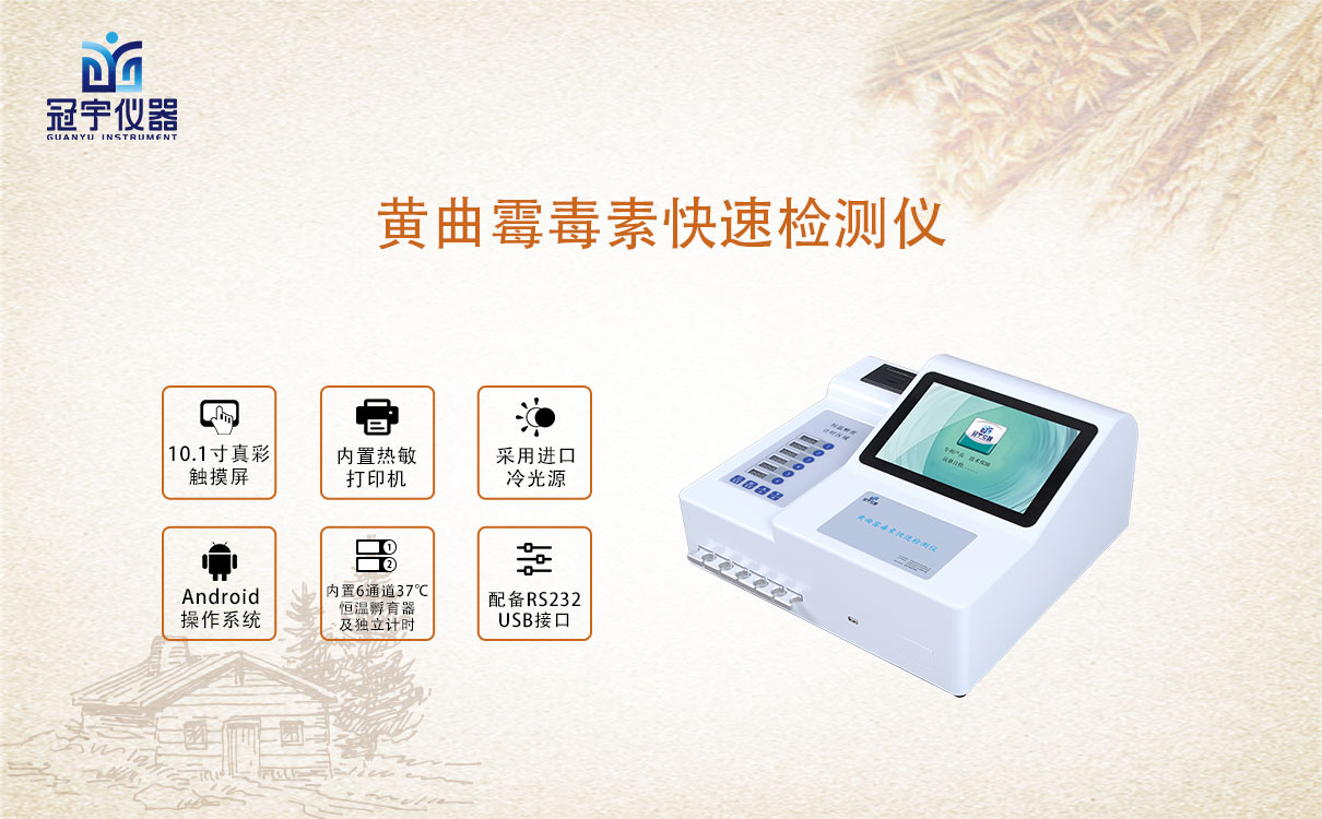 冠宇儀器黃曲霉毒素快速測(cè)試儀GY-710通過(guò)檢測(cè)線熒光定量卡中的熒光強(qiáng)弱程度,定量分析待檢樣品中黃曲霉毒素B1殘留含量;能夠快速定量檢測(cè)玉米、小麥、大米、大麥、小米和燕麥等谷物、飼料、面粉、食用油、木耳、調(diào)味品等食品中黃曲霉毒素B1,適用于糧庫(kù)收糧檢測(cè)、糧油監(jiān)測(cè)中心、糧油飼料生產(chǎn)加工、食品加工貿(mào)易、畜禽養(yǎng)殖戶自查、工商質(zhì)監(jiān)部門(mén)用于市場(chǎng)快速篩查等。