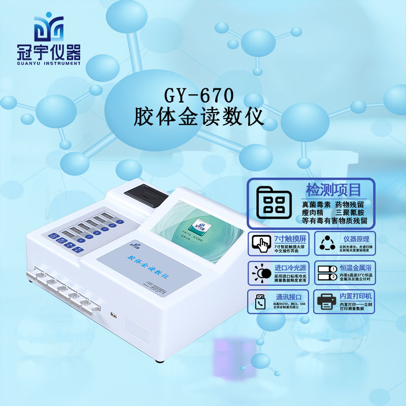 冠宇儀器膠體金檢測(cè)儀GY-610應(yīng)用膠體金免疫層析技術(shù)的原理,通過反射光譜法測(cè)試CT線強(qiáng)弱程度可以檢測(cè)生化卡、金標(biāo)卡及液態(tài)滴定模塊制成的獸藥、瘦肉精、抗生素、動(dòng)物疫病、農(nóng)藥殘留、臨床疫病、水質(zhì)安全、等有毒有害物質(zhì)殘留項(xiàng)目。