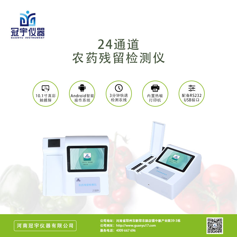 河南冠宇儀器有限公司生產(chǎn)的新一代智能型農(nóng)藥殘留檢測(cè)儀能準(zhǔn)確、快速檢測(cè)出蔬菜、水果、糧食、茶葉以及土壤中有機(jī)磷和氨基甲酸脂類農(nóng)藥殘留的快速檢測(cè)。