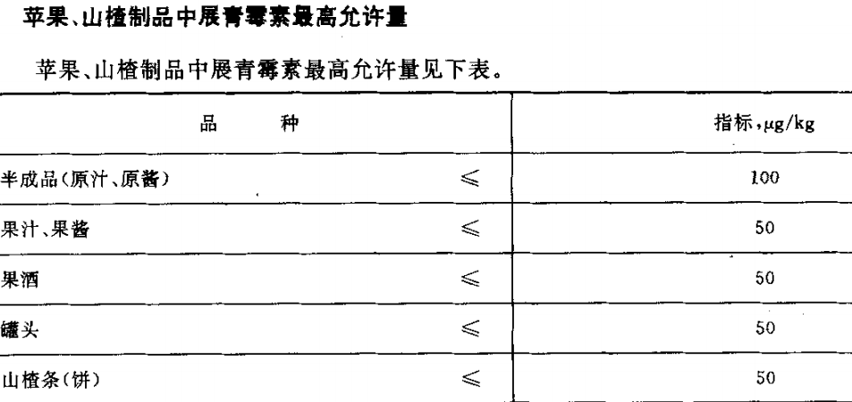 以下是蘋(píng)果、山植制品中展青霉素最高允許量見(jiàn)下表: