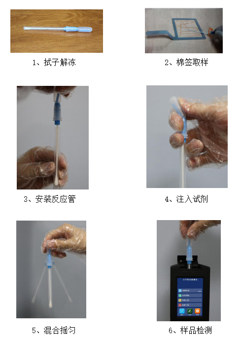 6、樣本檢測:將拭子插入處于待檢測界面的ATP儀器實驗倉內,閉合儀器上蓋,開始檢測。