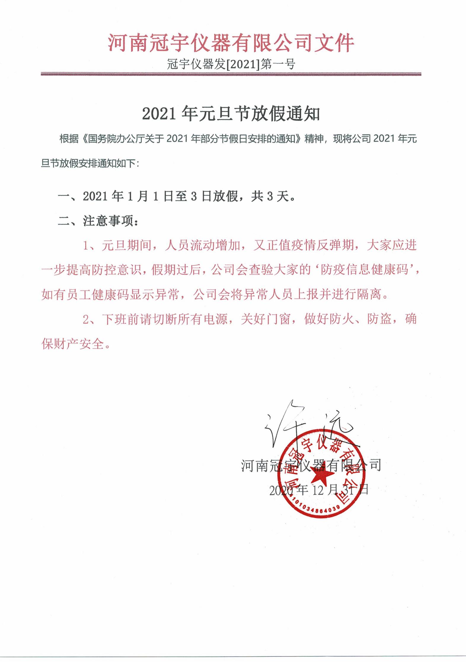 河南冠宇儀器有限公司2021年元旦節(jié)放假通知