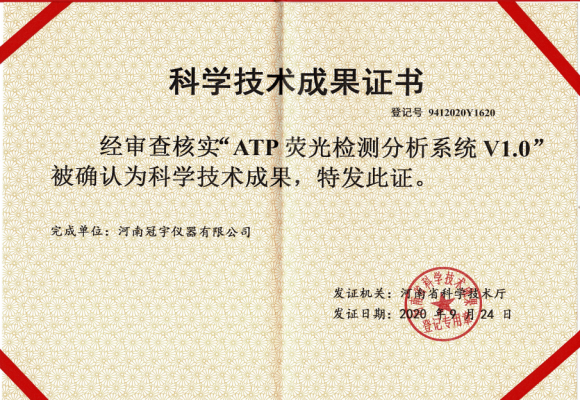 河南冠宇儀器有限公司(以下簡稱:冠宇儀器)繼多項(xiàng)軟件著作權(quán)證書、實(shí)用新型專利證書、計(jì)算機(jī)軟件著作權(quán)等一系列證書之后,又獲由河南省科學(xué)技術(shù)廳頒發(fā)的一項(xiàng)“ATP熒光檢測分析系統(tǒng)V1.0科學(xué)技術(shù)成果證書”,一系列的權(quán)威肯定,彰顯了冠宇儀器強(qiáng)大的技術(shù)研發(fā)能力,也體現(xiàn)出公司為客戶提供優(yōu)質(zhì)產(chǎn)品的強(qiáng)大決心。
