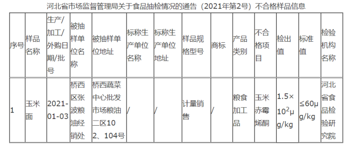 河北公布162批次樣品抽檢結果 1批次玉米面檢出玉米赤霉烯酮不合格