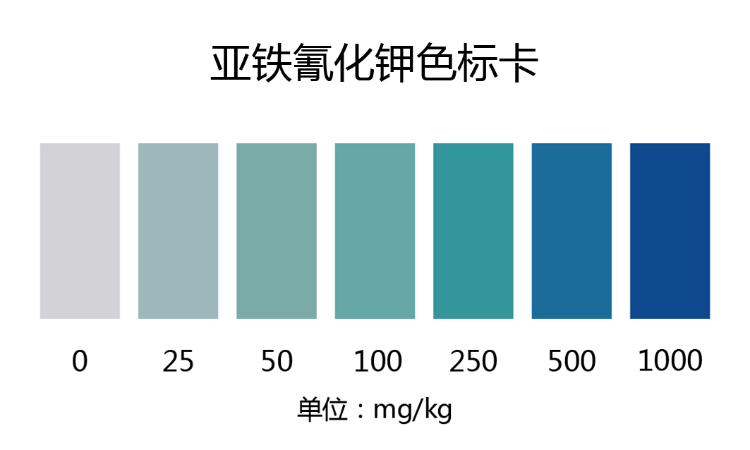 比色管顏色藍色越深,亞鐵氰化鉀含量越高。