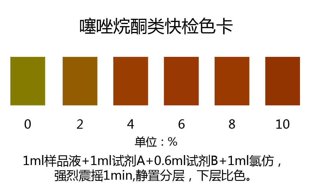 取上述濾液0.5 ml于玻璃比色皿或試管中,加入0.5 ml檢測(cè)試劑A,0.3 ml檢測(cè)試劑B,搖勻,加入1ml氯仿,強(qiáng)烈震搖1min,靜置分層,觀察下層顏色,對(duì)照色卡比色,噻唑烷酮類降血糖藥物含量越高,顏色越深;